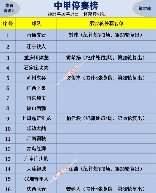 中超第27轮今天依然开启,而中甲在这个十月也追上了中超的脚步,第27轮色泽两天也迎来多场对决,比拟第23到26轮每轮齐有10多东说念主因顺序科罚省略红黄牌停赛不同,本轮启动停赛东说念主数有了显然的裁汰。