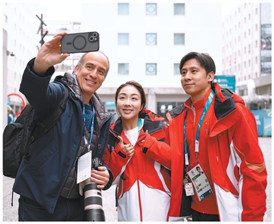 当地时候2月3日,看雄伟利米兰奥运村,别称记者(左一)与中国花滑队诱导员自拍眷恋。新华社记者张豪夫摄
