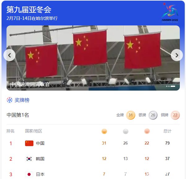 北京时候2月13日音问体育集锦,2025年第9届亚洲冬季畅通会持续进行。第五个比赛日为止后,中国代表团以以31金26银22铜持续高居第一,