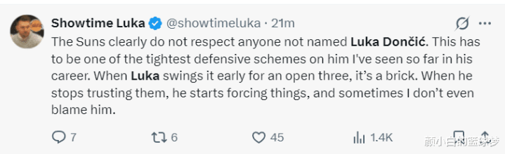 但东契奇的球迷这么评价:太阳队彰着对除卢卡-东契奇以外的任何球员齐不屑一顾。这可能是我做事生活中见过针对他的最严实的留神战略之一。谁东契奇为队友创造空位后对方总能封盖见效,东契奇不再信任队友我方强攻,是以掷中率不高,我小数齐不怪他。